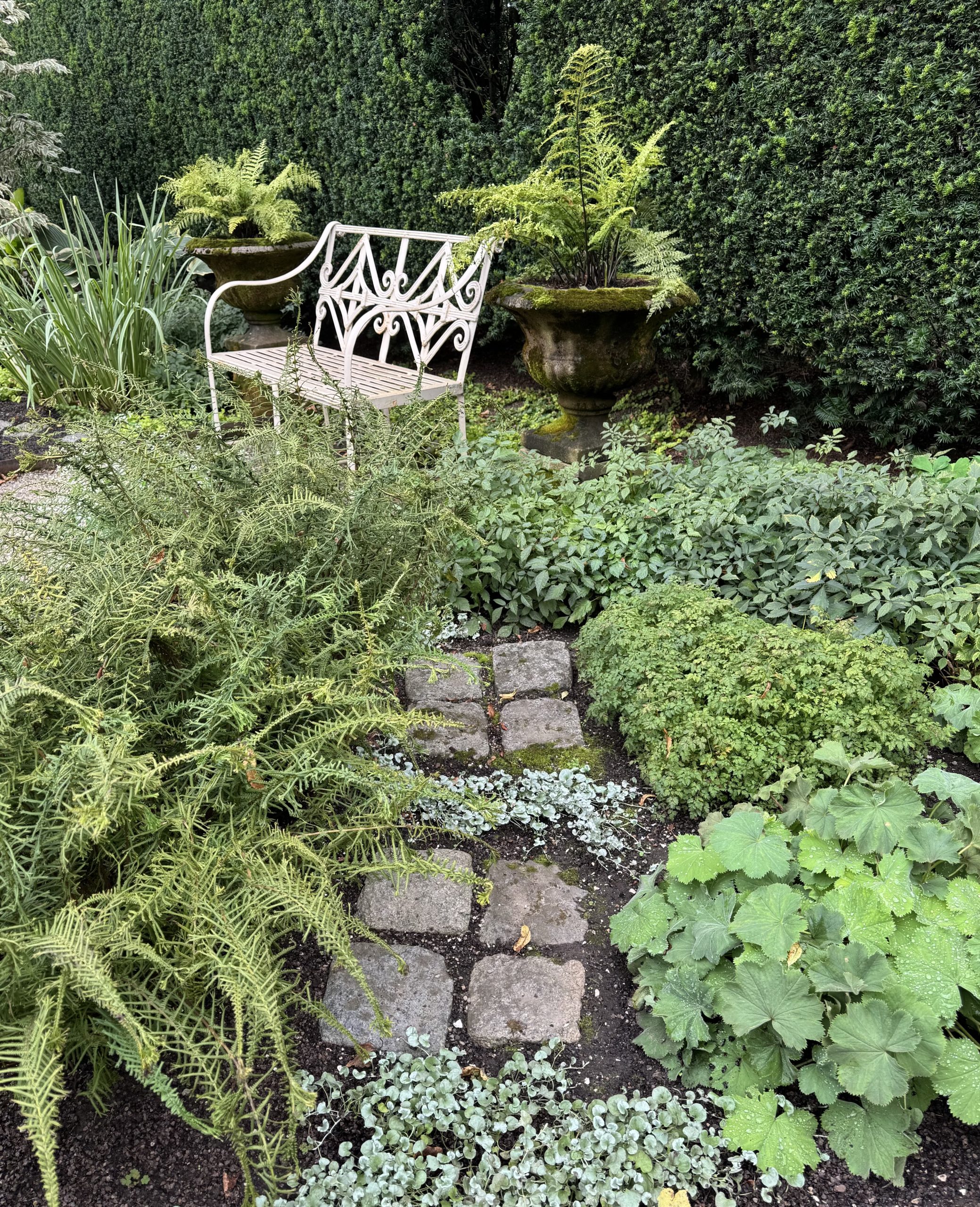 A detail I adore…silver dichondra brightening up the cobblestone paths throughout the herbaceous beds.
