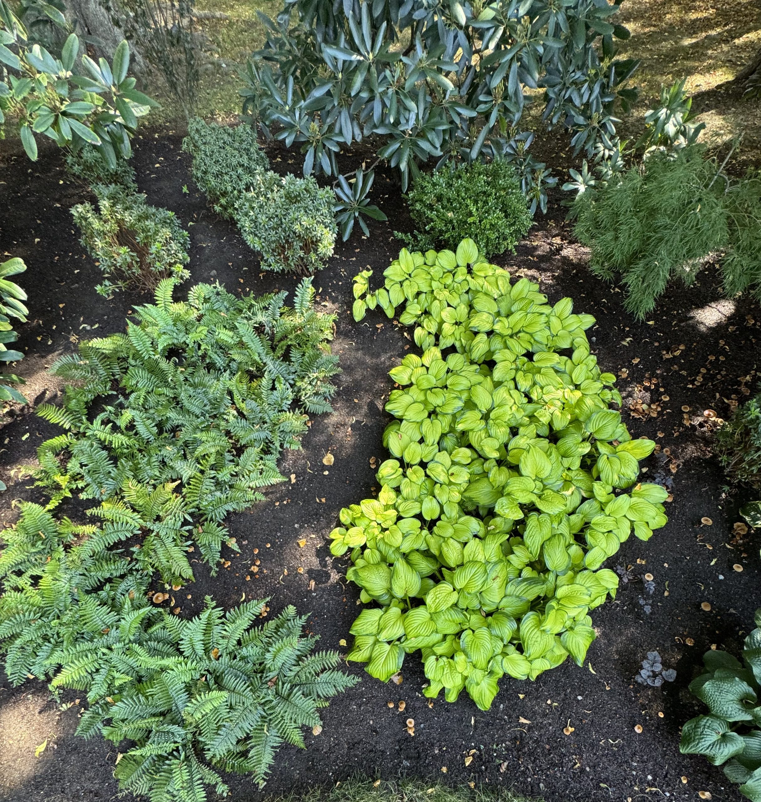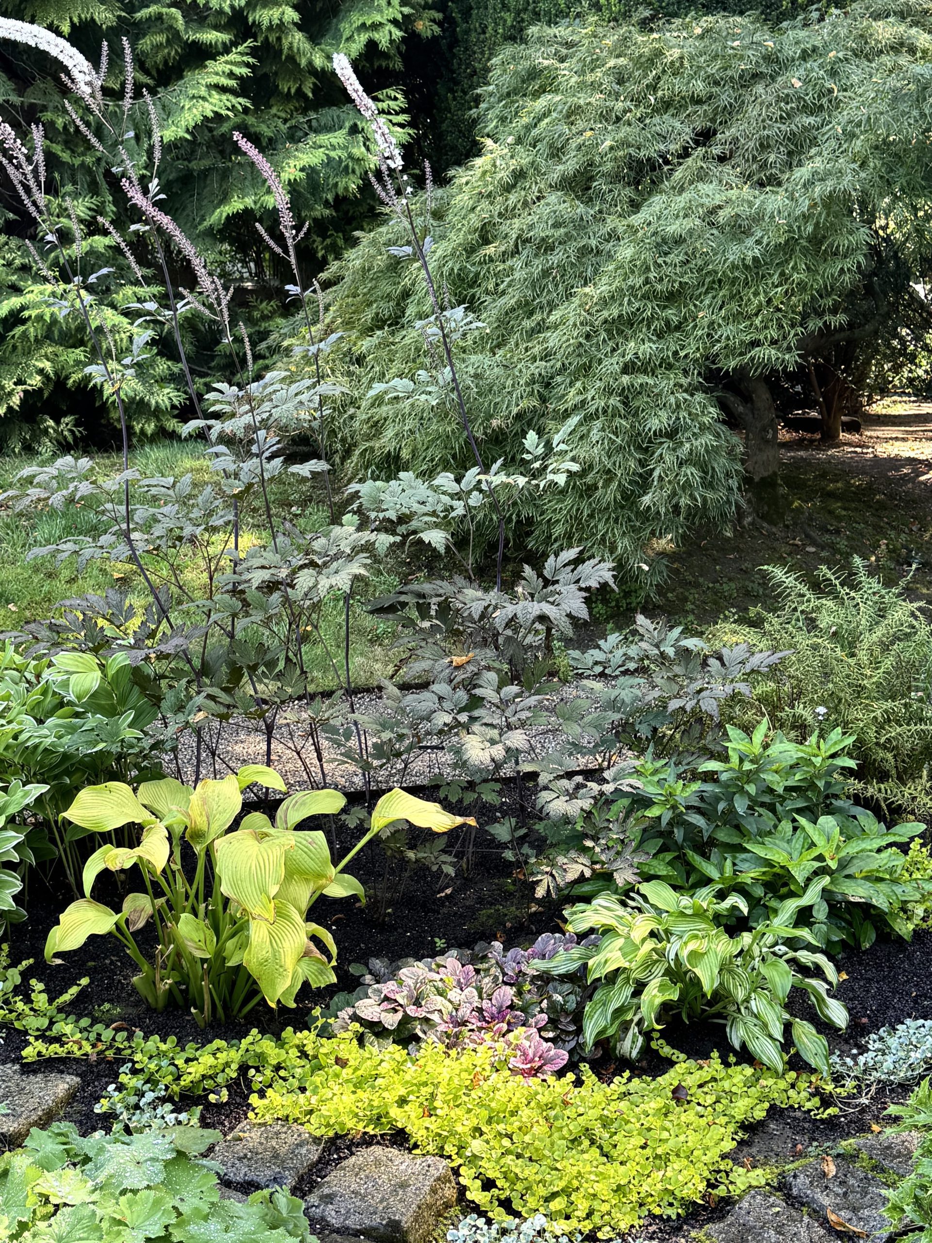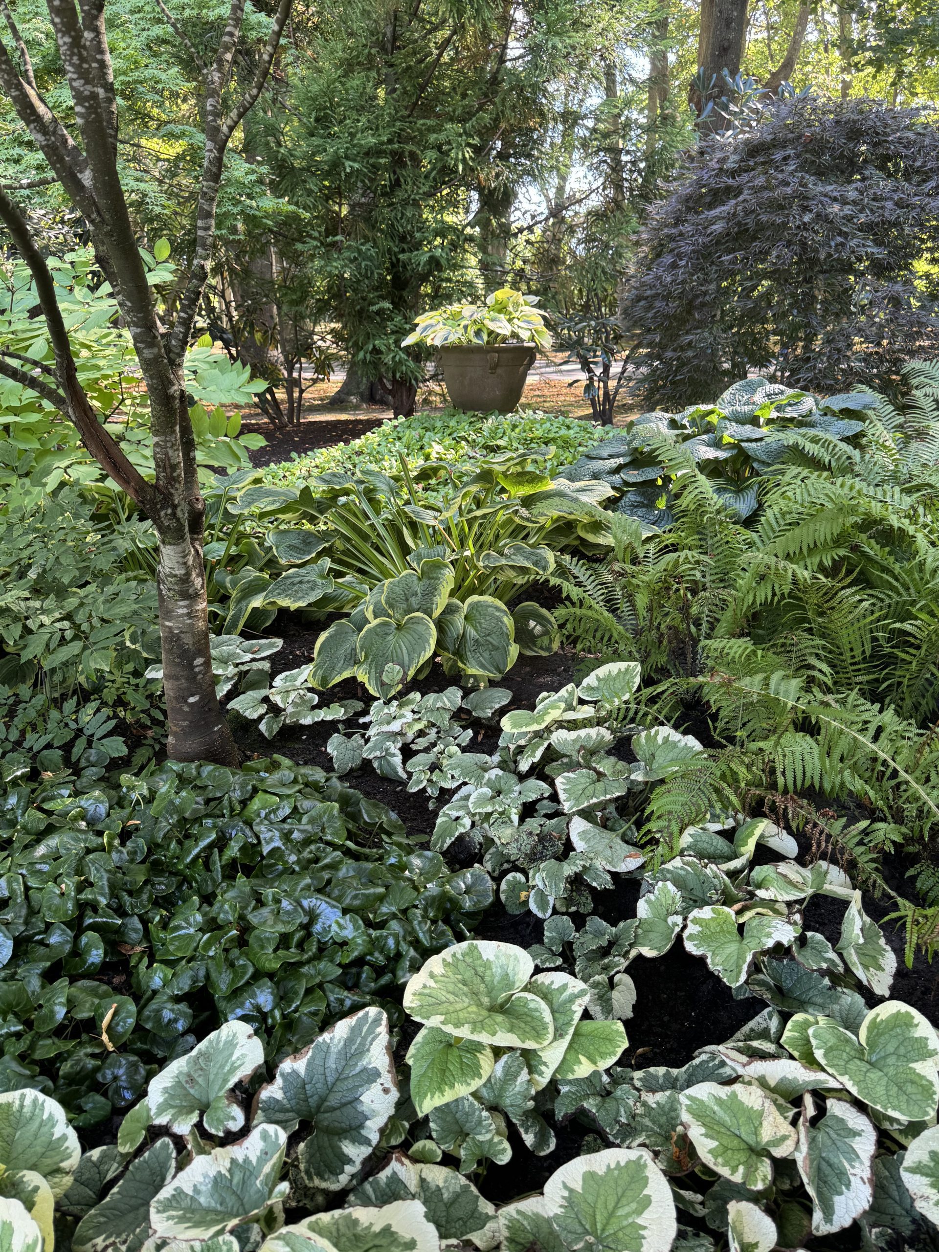 In the newly completed Woodland Garden the fun signature of paisley motifs is to be searched out…the most prominent? Tassel fern on the left and ‘Stained Glass’ hosta on the right…with small scatterings of rawhide-brown mushrooms responding to the rain’s call.