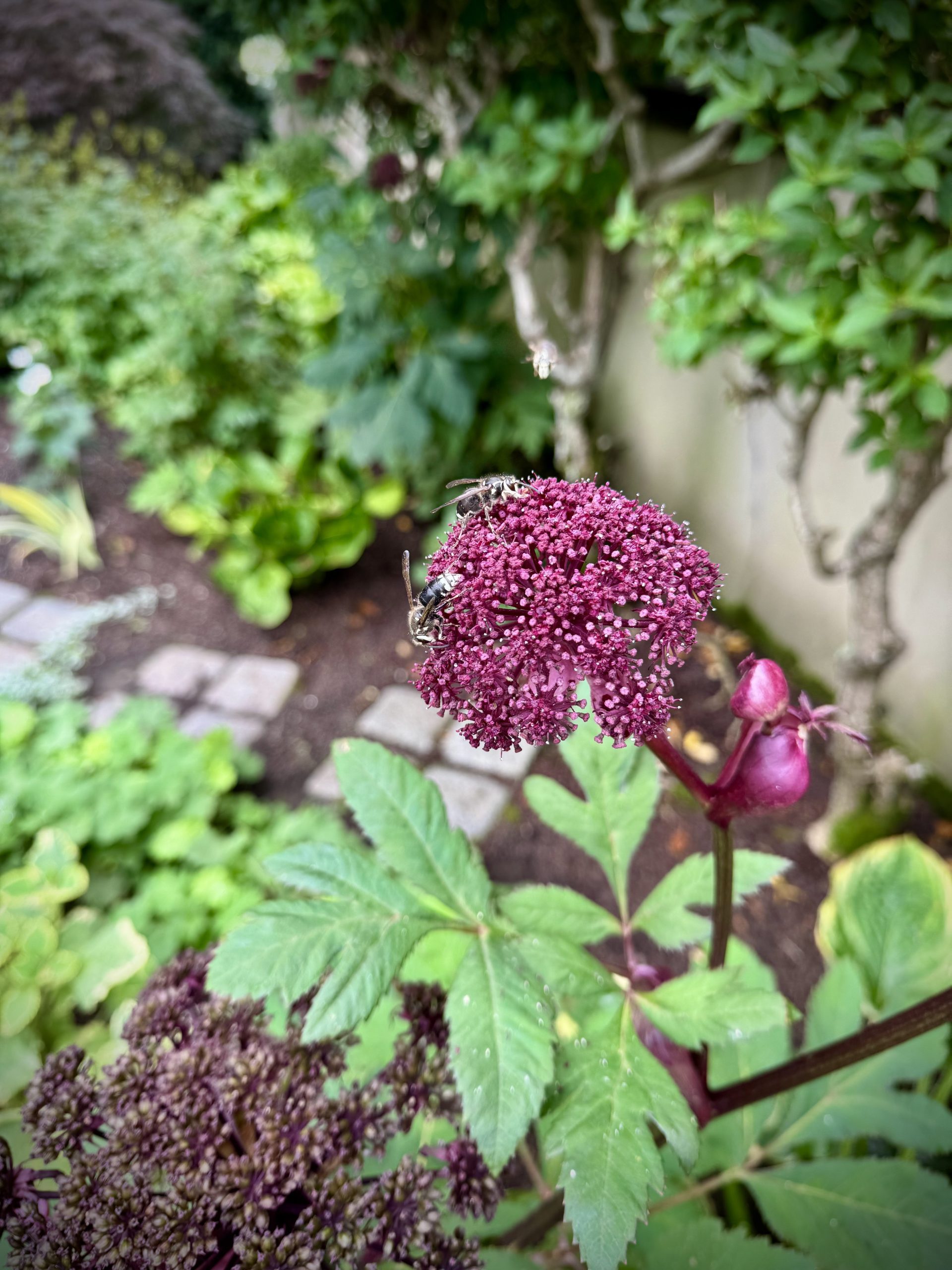 An unusual hornet, with white/black rings, I have only seen on this specific plant, Angelica.