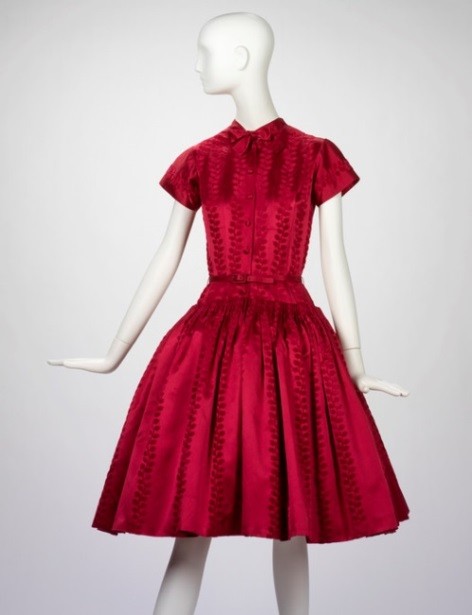 Norman Norell, Traina-Norell, label dress, ca. 1949, silk, satin weave, cut warp pile. Gift of Mark Pollack.