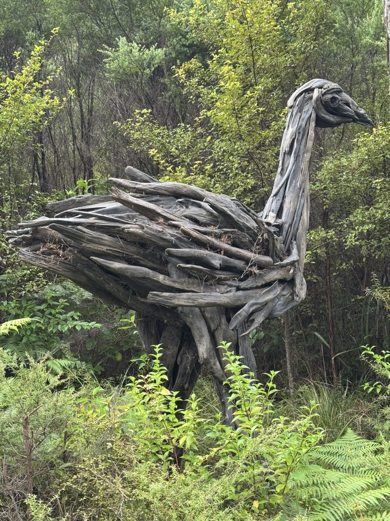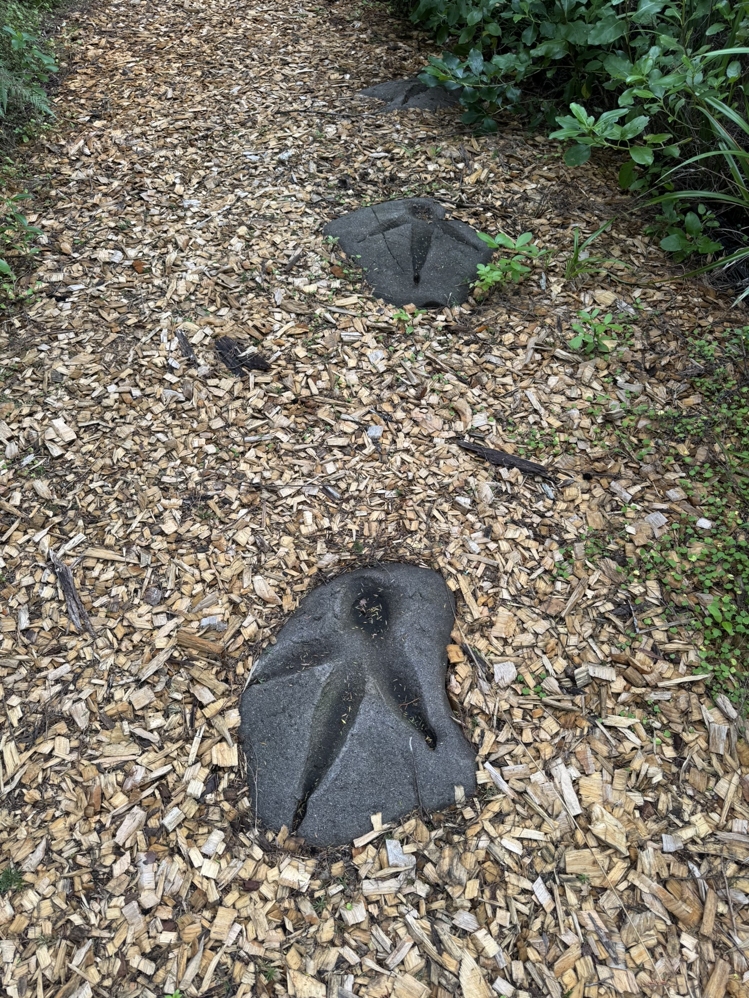 This piece of artwork honors the Moa, a native to NZ, flyless bird from the dinosaur era, standing app. 16ft. The “leaves” in the stepping stones are emulating the Moa’s footprints!!
