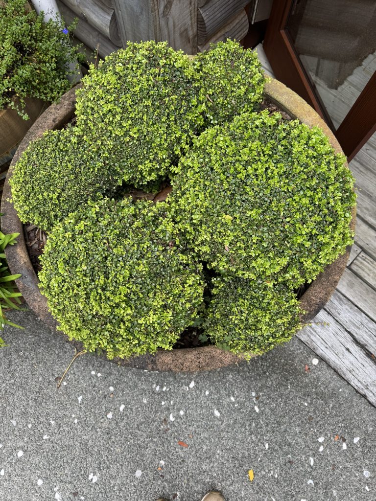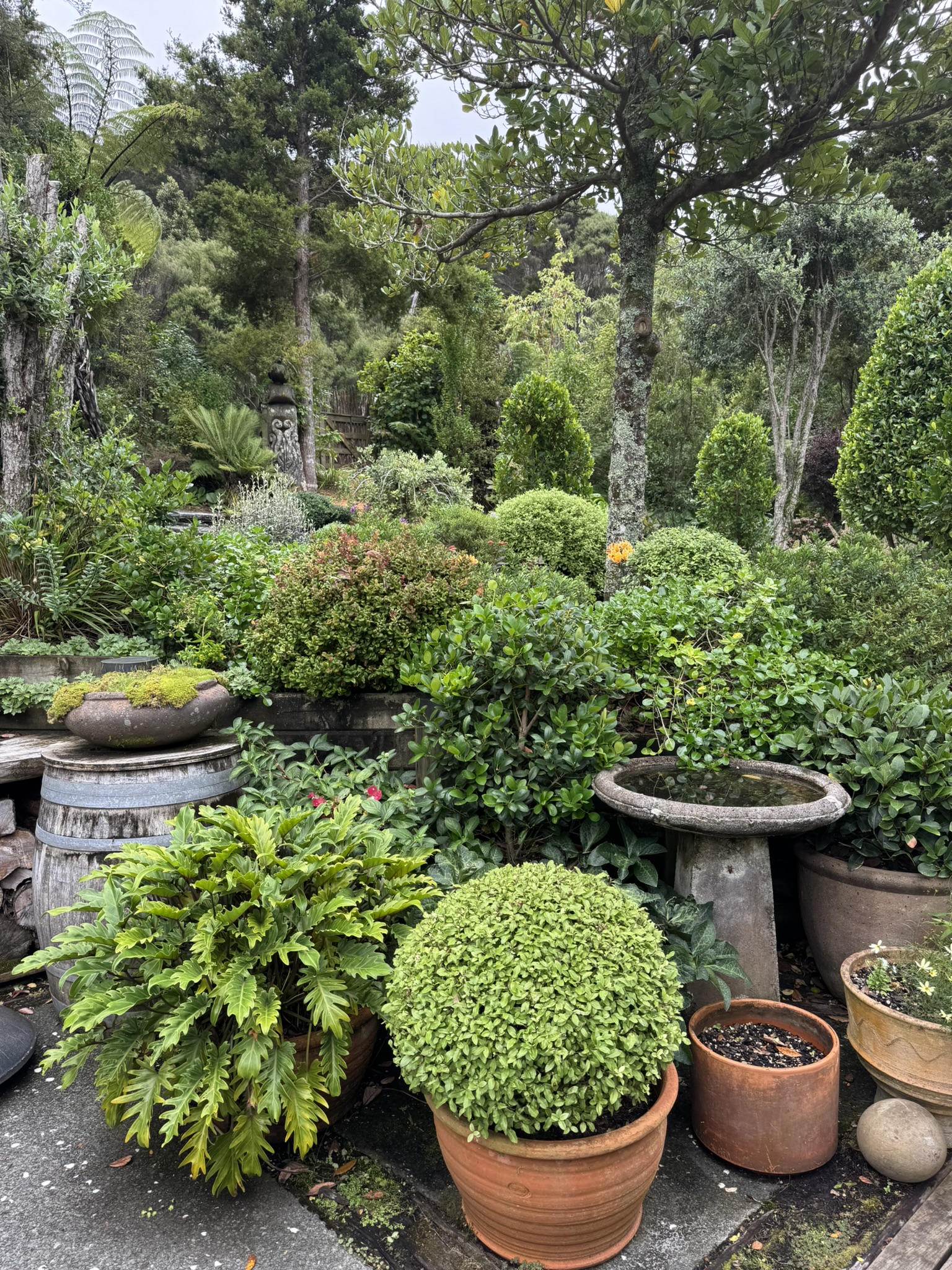 It was a delight to finish this visit back at Liz’s courtyard with its collection of another example of her passion for neatness and tidiness….varied pots, but all very complementary, showing off fave plants (I am green with envy that she can grow pittosporum, a wonderful substitute for boxwood).